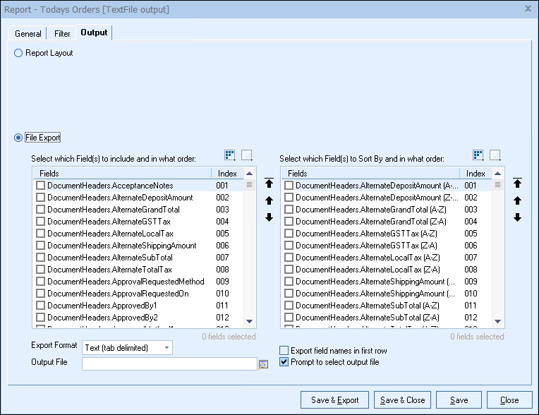 3) Next, start selecting the fields you want exported to CSV or Text file on the left hand side. On the right hand side, select the sorting fields (these are optional). The sorting field selections will let you sort based on the field data to order the information alphabetically or numerically. For example, if you wanted to sort by the Grand Total field from highest grand total to lowest grand total, you would select the field called DocumentHeaders.GrandTotal (Z-A).