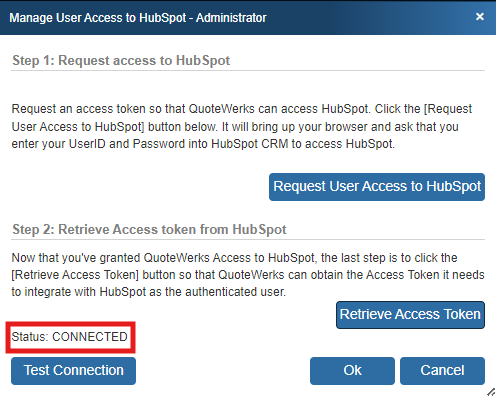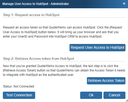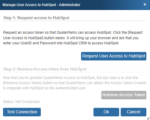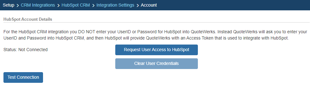 You need to authorize QuoteWerks and HubSpot CRM to work together. To do this, click on the [Request User Access to HubSpot] button.