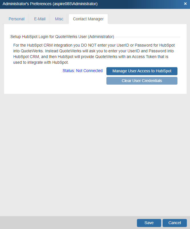 Each user in QuoteWerks will also need to authorize their HubSpot login with QuoteWerks. To do this, they need to open QuoteWerks and login under their name in QuoteWerks and then click on Setup > My Preferences. Each user then needs to follow the same steps from above to authorize.