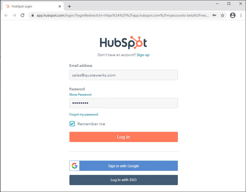 This will open your web browser and prompt you to log into HubSpot. Enter your credentials on this screen and click the [Log in] button.