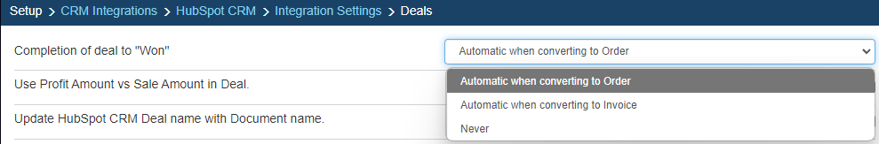•Never, which means QuoteWerks will never attempt to complete the Opportunity, the Opportunity will need to be manually updated within HubSpot CRM. This provides a greater level of control for sales managers or administrators who'd prefer to manually close Opportunities from within HubSpot CRM rather than have QuoteWerks close them automatically.