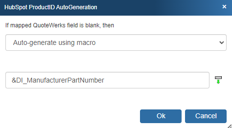With this option, when exporting items to the HubSpot CRM Opportunity, instead of just using a simple field value like the ManufacturerPartNumber to become the HubSpot CRM Name, you can choose to have the HubSpot CRM Name Product ID auto-generated using a macro such as &DI_ItemType:&DI_ManufacturerPartNumber.
