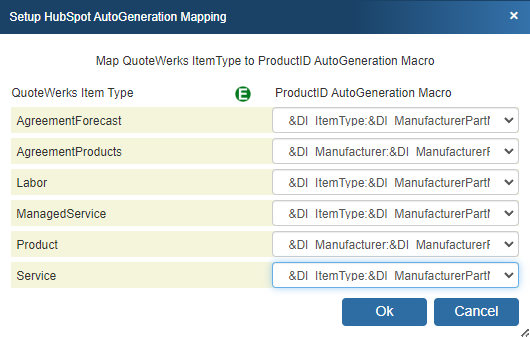 With this option, when exporting items to the HubSpot CRM Opportunity, instead of just using a simple field value like the ManufacturerPartNumber to become the HubSpot CRM Name, you can choose to have the HubSpot CRM Name Product ID auto-generated using a macro using the QuoteWerks Item Type field (such as product, service, labor, etc.). Click on the [Map Item Types] button to map your existing QuoteWerks Item Types with the macros for Product ID Name generation.
