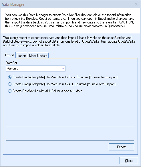 2. Use the Export function to obtain a file with the necessary column headers. To do so select the Export Tab, select Vendors as your data set, select Create Empty (template) DataSet file with Basic Columns, and click on Export.