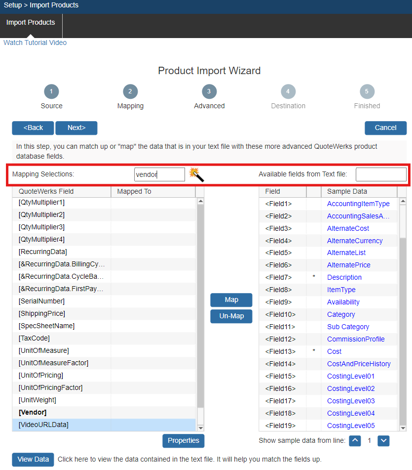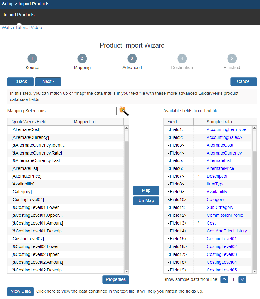 On this step, the wizard will allow you to “map” some of the more advanced data fields that QuoteWerks uses. Only advanced users will need to map these fields. Choose a QuoteWerks field from the list on the left, then choose a matching field from the list on the right, then click on the [Map] button to “map” the fields together. Once fields are mapped together, you will see the field number from the text file listed in the “Mapped To” column of the mapping selections list. Once a field from the text file has been mapped, an asterisk symbol will be displayed next to the field, letting you know that you have already mapped that field.