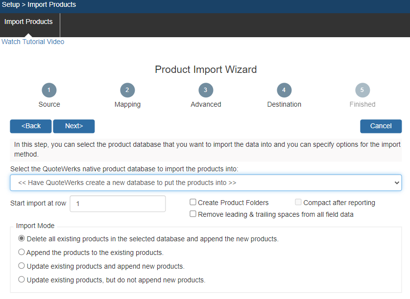 To have QuoteWerks create a new native product database to store the imported products, select that option from the drop-down list.