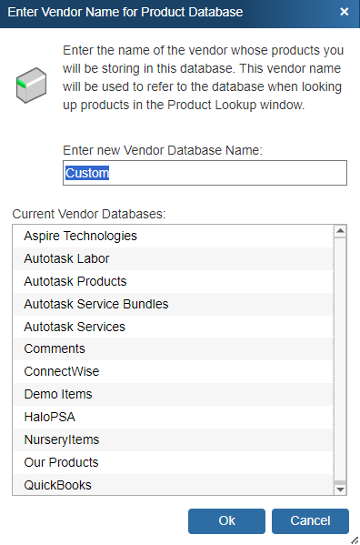 Next, the “Enter Vendor Name for Product Database” window may appear.