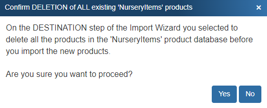 The “Confirm deletion” window will appear. This window will confirm your decision to delete all the existing products in the selected product database that you chose on the DESTINATION step of the Import Wizard.