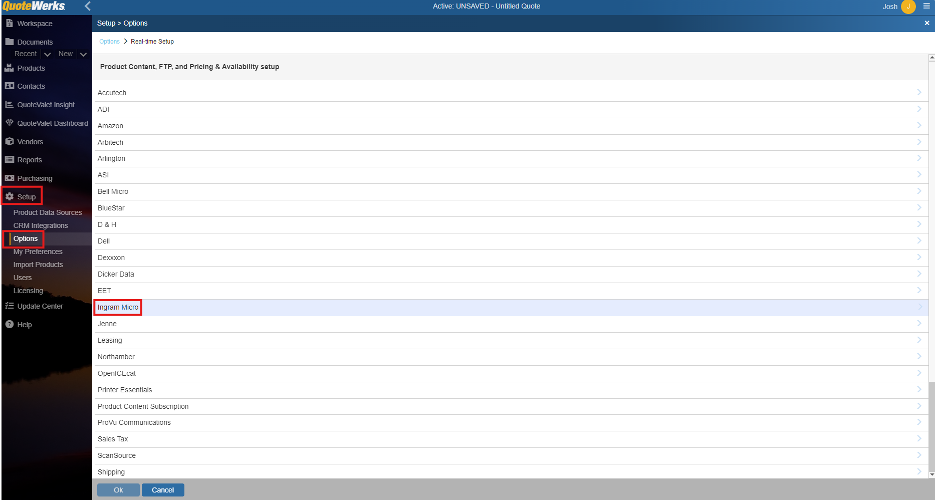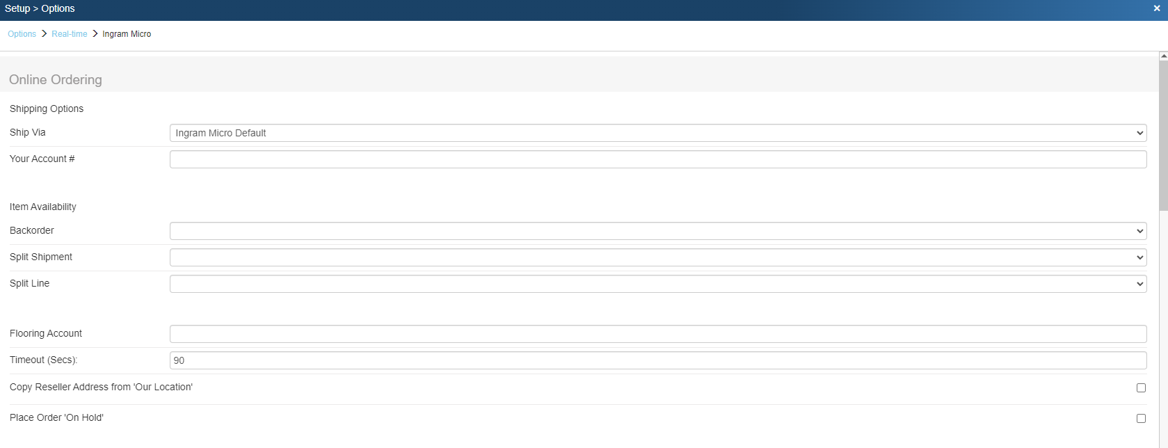 1. To setup Ingram Micro Real-time pricing and availability navigate to Setup > Options > Real-time Setup and select Ingram Micro.