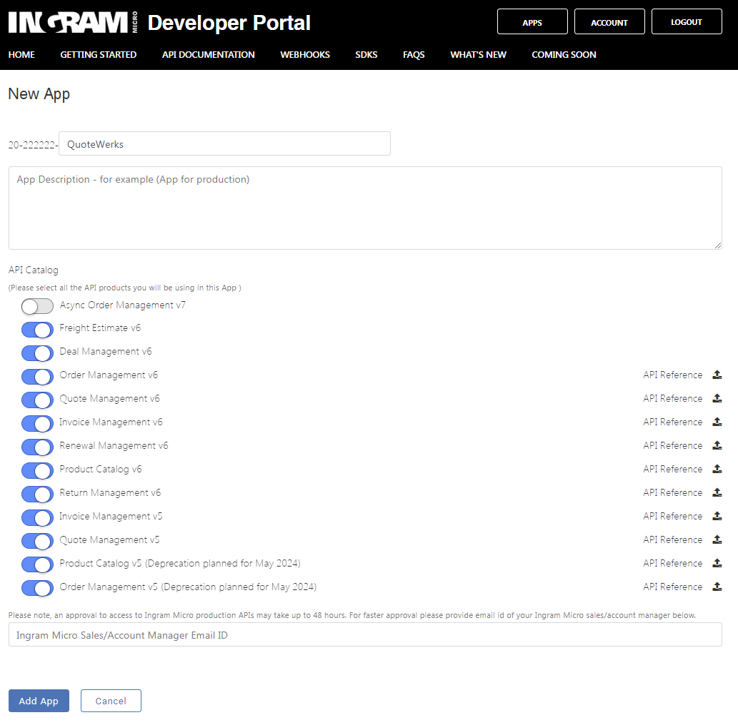 5.Under the "API Catalog" section, click and enable all of the options except Async Order Management v7. If you have your Ingram Micro Sales Rep's email, include that as well for faster approval.