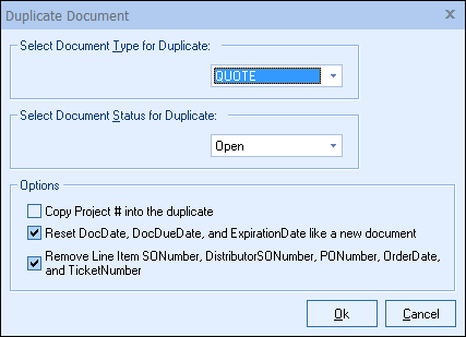 When duplicating a document, you will have the option of selecting what document type to duplicate it into as well as the Document Status and whether or not to copy the project number into the duplicate. The duplicated document will appear as the current document with all of the information from the original.