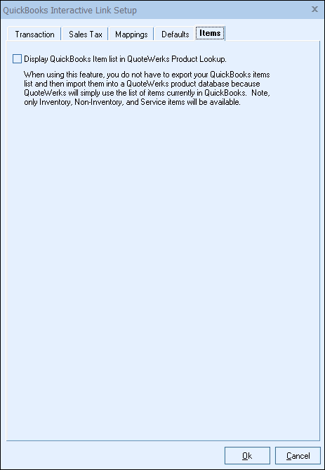 Check the Display QuickBooks Item list in QuoteWerks Product Lookup. box to display the QuickBooks product source on the Products -> Lookup window in QuoteWerks.