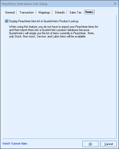 On this tab you can choose to display your Sage 50 (Peachtree) item list in the QuoteWerks Product Lookup. As a result, you no longer have to export your price list from Sage 50 (Peachtree) and import it into QuoteWerks. You can also view Sage 50 (Peachtree) product availability in real-time using this method.