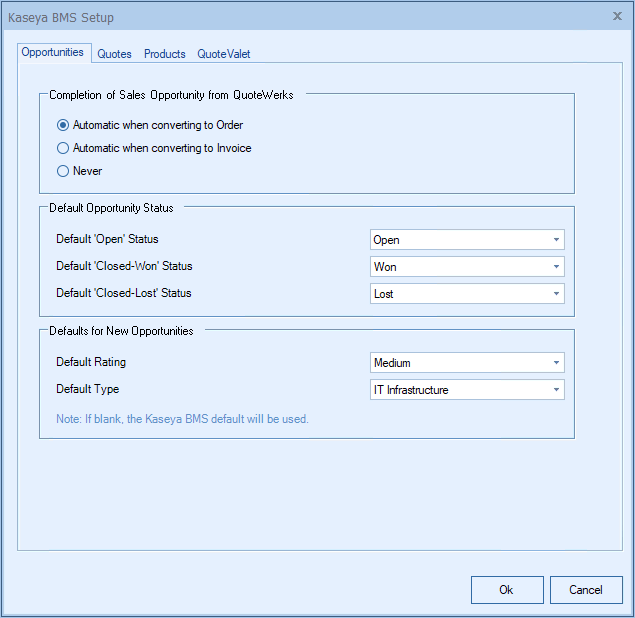The Kaseya BMS Setup defines defaults for Kaseya BMS opportunities and for the linked product data source.