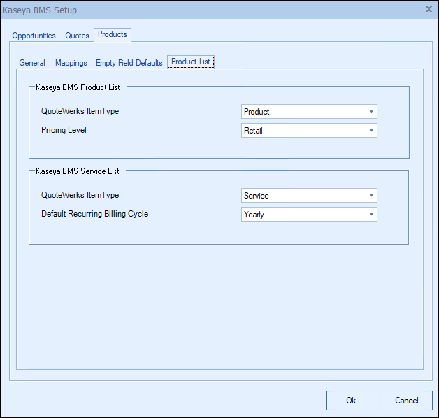 Here you can map the Kaseya BMS Product list to the preferred QuoteWerks Item Type as well as set the Pricing level in QuoteWerks for the Kaseya BMS Product List for QuoteWerks to use. For example, if set to Product as it is in the screenshot above, when you pull a Product item from the Kaseya BMS Product List in QuoteWerks, QuoteWerks will pull that item in with a "Product" Item Type designation ensuring it will go back over to Kaseya properly.