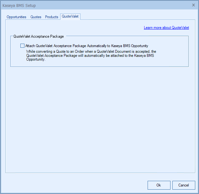 This checkbox will automatically upload and attach the QuoteValet Acceptance Package to the Kaseya BMS Opportunity when the QuoteValet quote is accepted and converted to an Order in QuoteWerks.