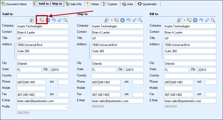 button on the toolbar of the Sold To / Ship To tab. This button is only available when a contact has been pulled into QuoteWerks. The quick launch button will let you automatically view any opportunities or quotes associated with that contact.