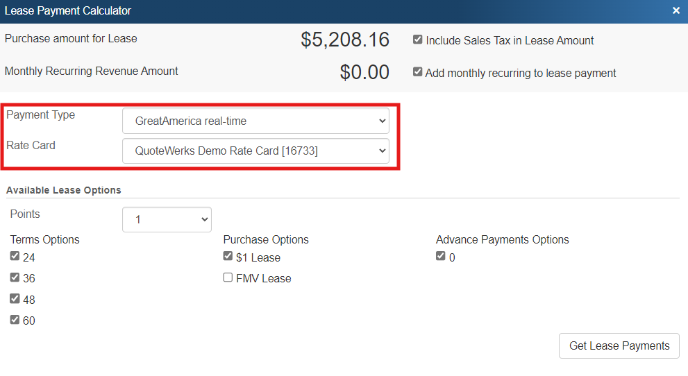 Important:   In order to add a Lease Payment Option, you will need to setup your leasing provider in QuoteWerks in the Leasing tab.  If you are using GreatAmerica and have a Real-time module, you will setup the Real-time Leasing Integration in the Real-time setup window.