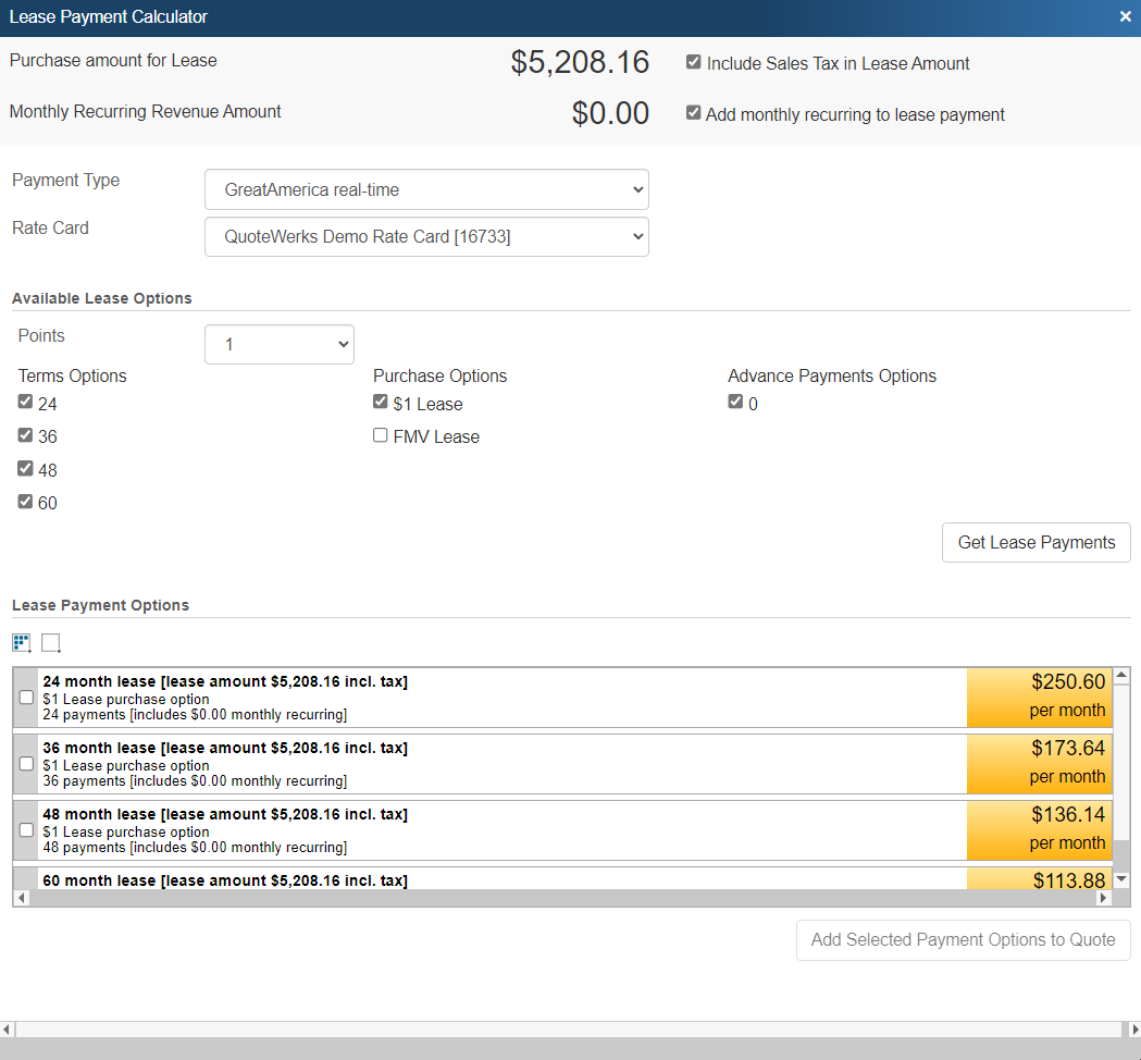 The Lease Payment Options provides users with an easy way to calculate different leasing options and present them to the customer on the quote such as 12 months, 24 months, 12 months with $1 buyout, etc.  All leasing companies are supported, they simply need to be added to QuoteWerks.  See the Leasing tab in the Options menu for information on setting up a default leasing company.