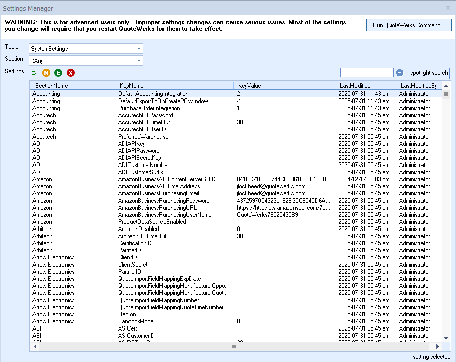 Important: Warning! This information is for advanced users only. Improper settings changes can cause serious issues. Only make changes if familiar with these settings and what needs to be changed. Additionally, most settings modified in this window will require a restart of QuoteWerks to take effect. The Settings Manager is available by navigating to Help -> About -> Settings Manager. |