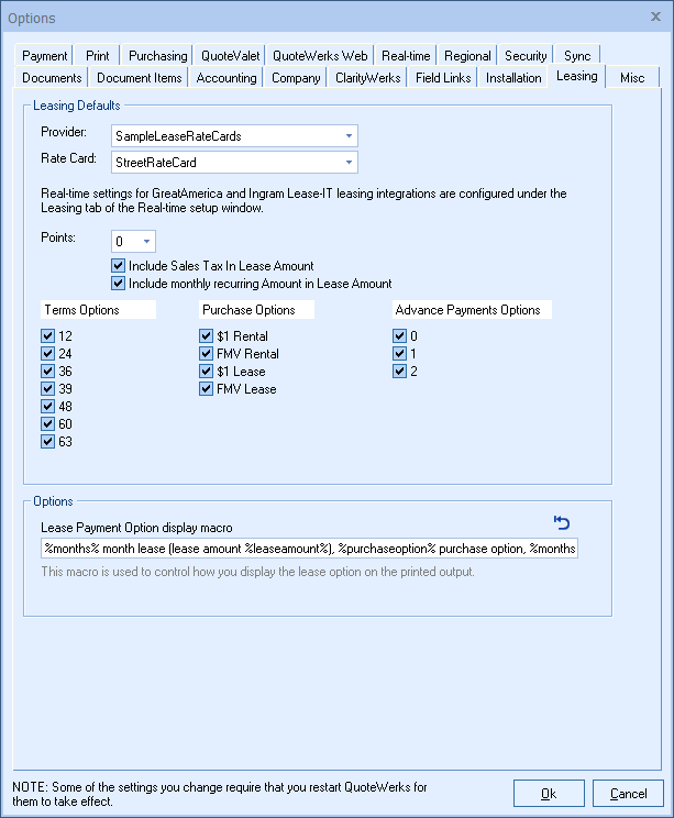 The Lease payment Option Display Macro enables users to modify the text that is used to display the lease payment options. By default it will display the lease amount, the purchase option(s), monthly payments, payment amount, advance payments. Users can adjust this text to fit their specific quotes. The