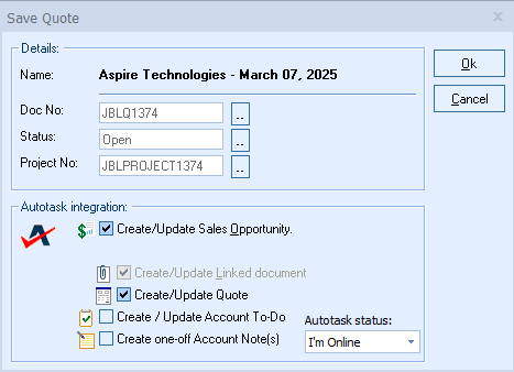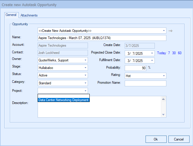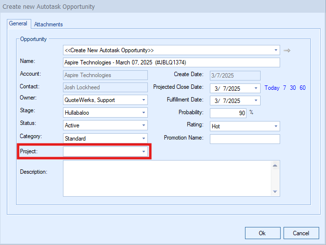 To choose which project to link this Opportunity to click the drop down menu and make your selection. When you hit OK, the Opportunity will be created in Autotask and associated with the Project you selected. You will now see the Opportunity listed in the Opportunity field in the project as seen below.