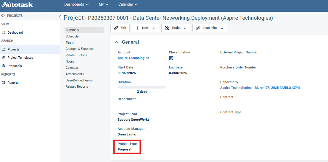 Important: The Project type in Autotask must be equal to Proposal for it to show on the project drop down menu. |