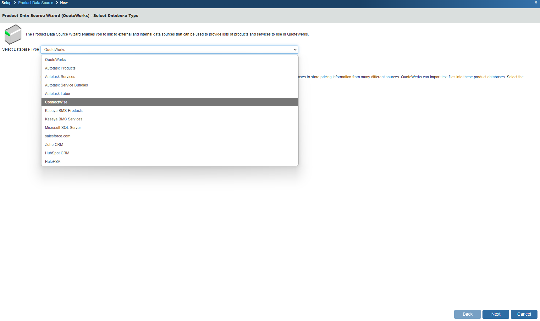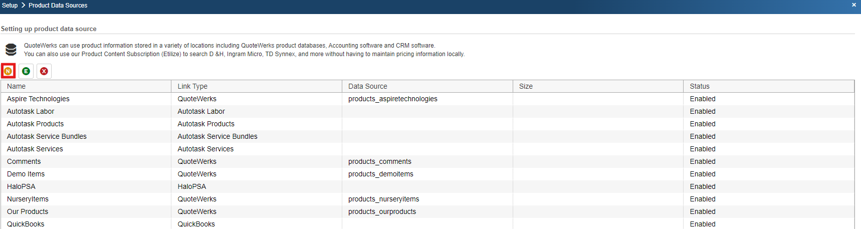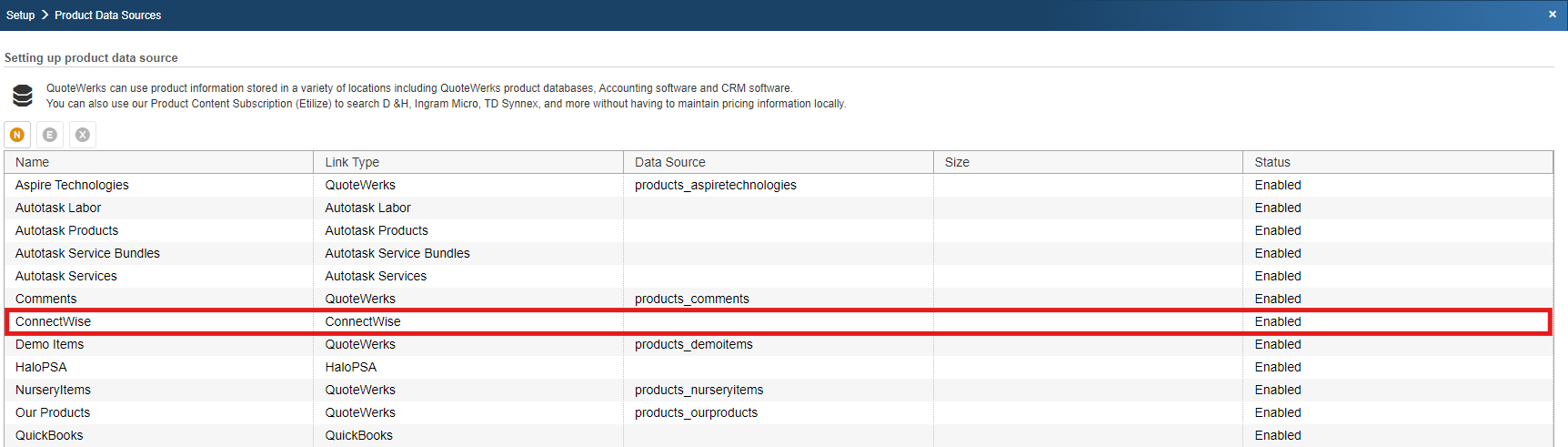 Step 2: In QuoteWerks, go to Setup -> Product Data Sources, then select the