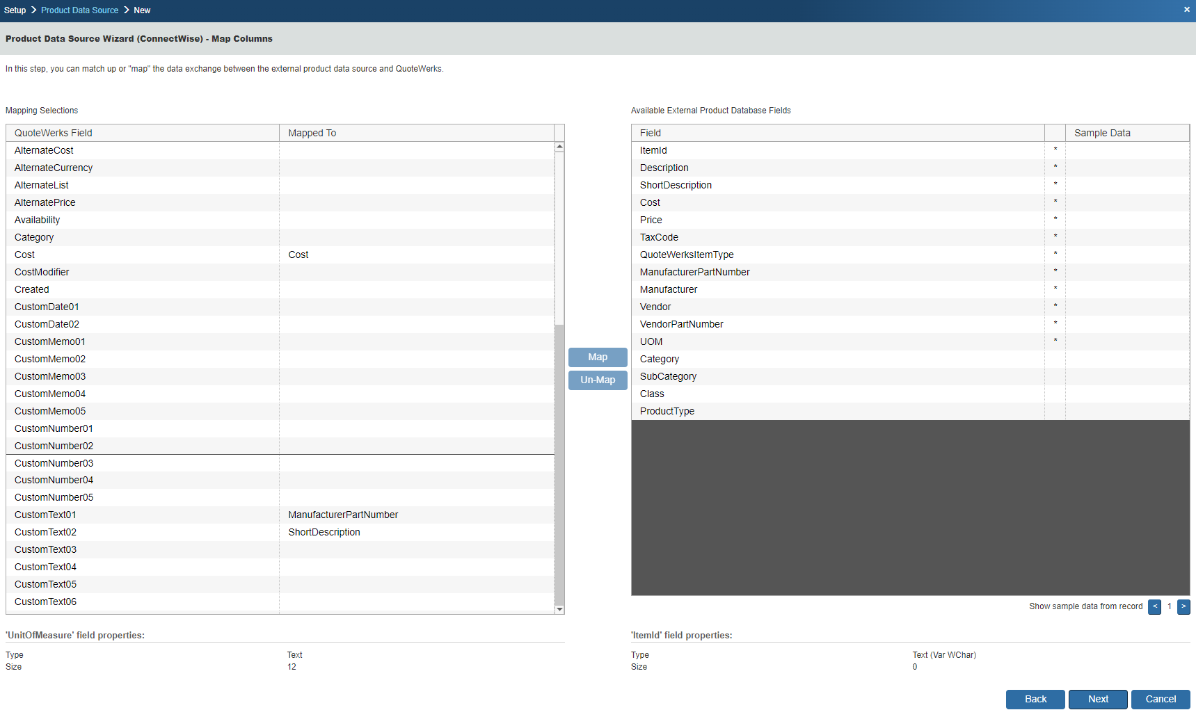 The fields available to be mapped include category, class, cost, description, item id, manufacturer, manufacturer part number, price, product type, QuoteWerks Item Type, Short Description, subcategory, tax code, UOM (unit of measure), vendor, vendor part number.