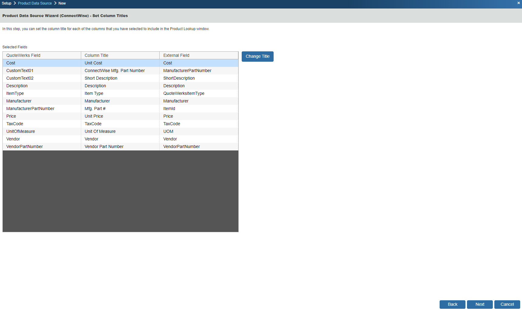 For example, in QuoteWerks the field name is called ‘Cost' but the Column Title is 'Unit Cost'. You may want to refer to this as simply ‘Cost.’ By clicking on the [Change Title] button you can rename the column title: