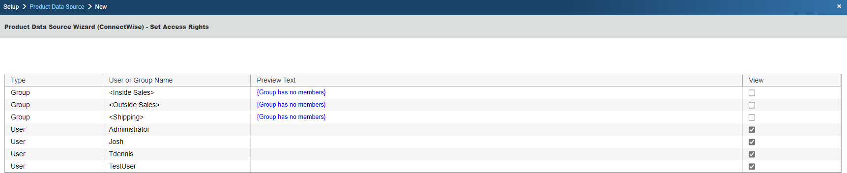 Step 7: If the ‘Individual Product Data Source level security’ has been enabled, the Security step will appear next:
