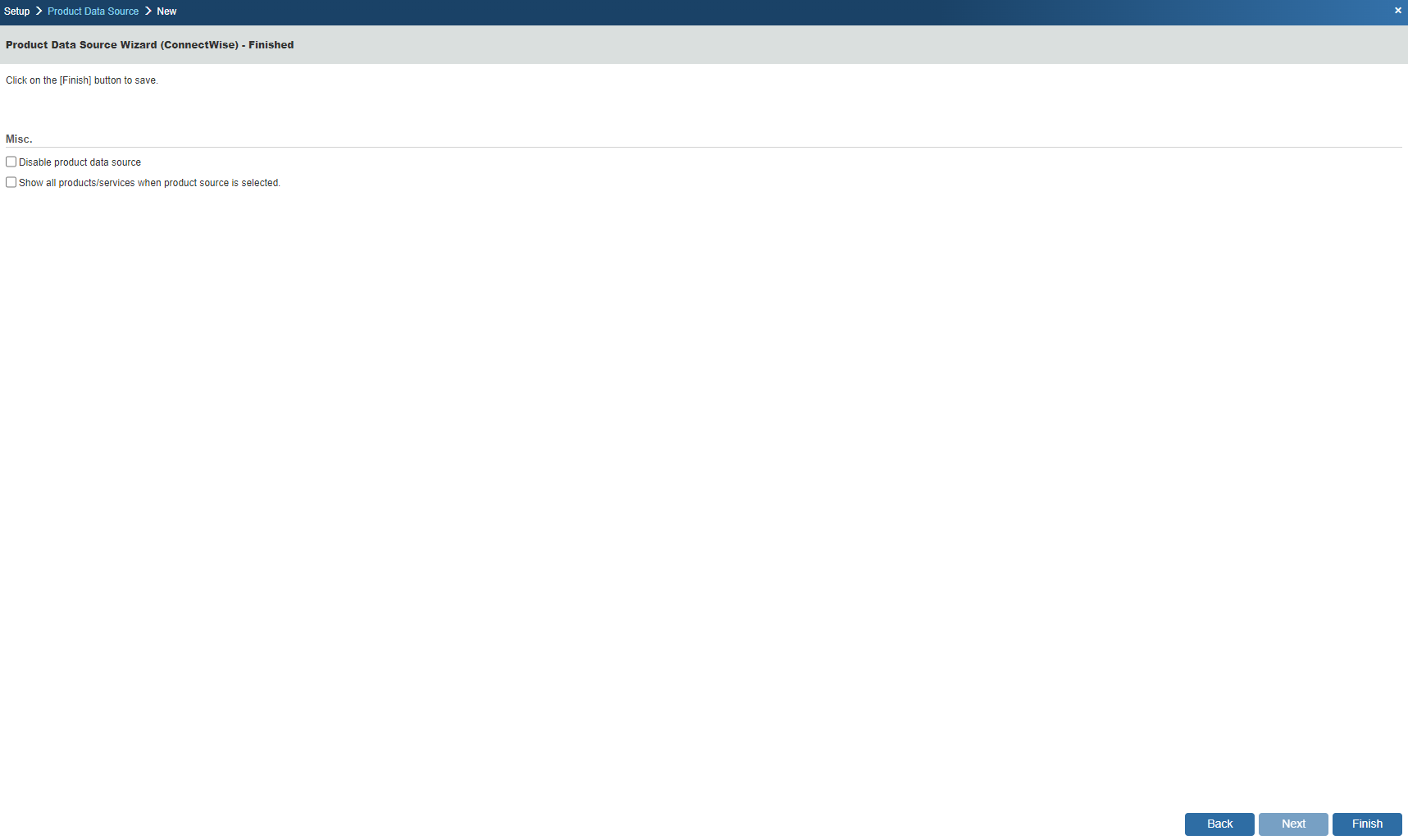 Step 9: Once you click on the [Finish] button it will return you to the Product Data Source Setup window where you can confirm that the link to the ConnectWise product list was established: