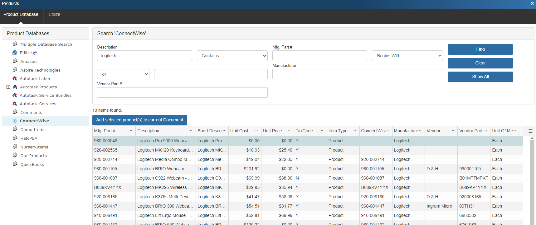 The ManufacturerPartNumber field searches the ConnectWise ItemId field and the ConnectWise Product ManufacturerPartNumber field. Additionally, when searching by the Description field in QuoteWerks, QuoteWerks will search both the Description and Customer Description fields in the ConnectWise Product Catalog to find a match.