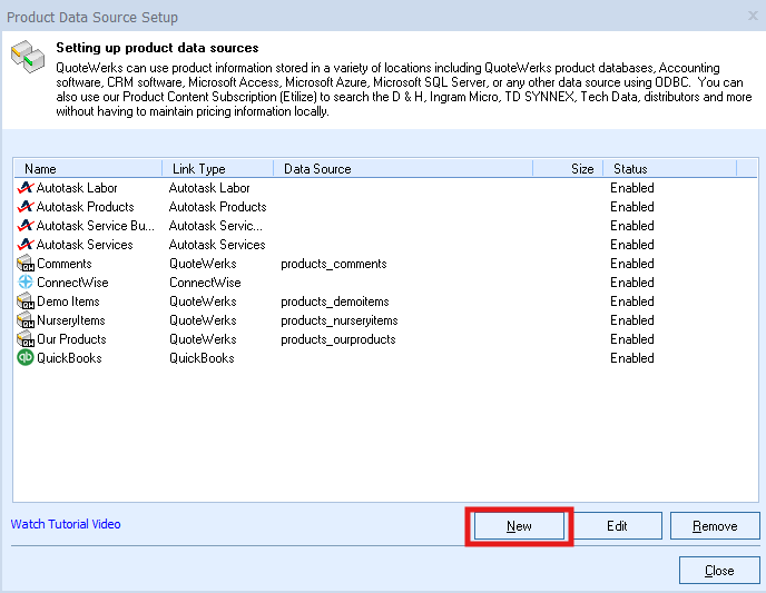 Step 2: In QuoteWerks, go to the Products -> Setup Product Sources menu, then select the [New] button on the Product Data Source Setup window: