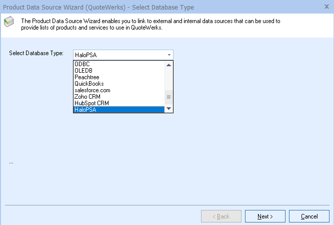Step 3: From the “Select Database Type” window, select “HaloPSA” from the drop down menu: