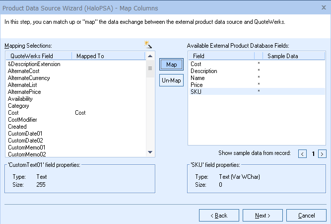If you want to change our default selections, simply select the HaloPSA field on the right, then select the QuoteWerks field on the left and choose to map or un-map the fields.