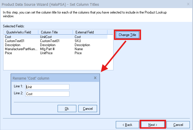 For example, in QuoteWerks the field name is called ‘Cost' but the Column Title is 'Unit Cost'. You may want to refer to this as simply ‘Cost.’ By clicking on the [Change Title] button you can rename the column title:
