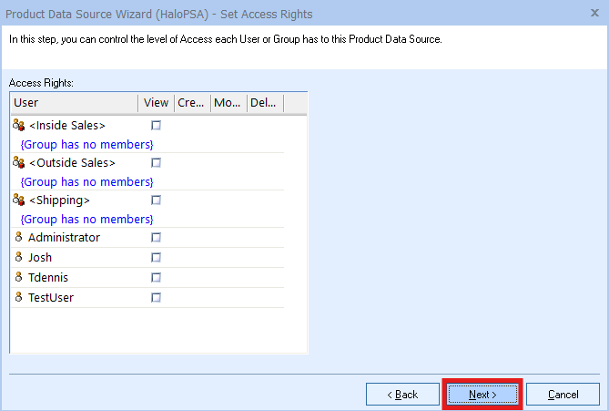 Step 7: If the ‘Individual Product Data Source level security’ has been enabled, the Security step will appear next: