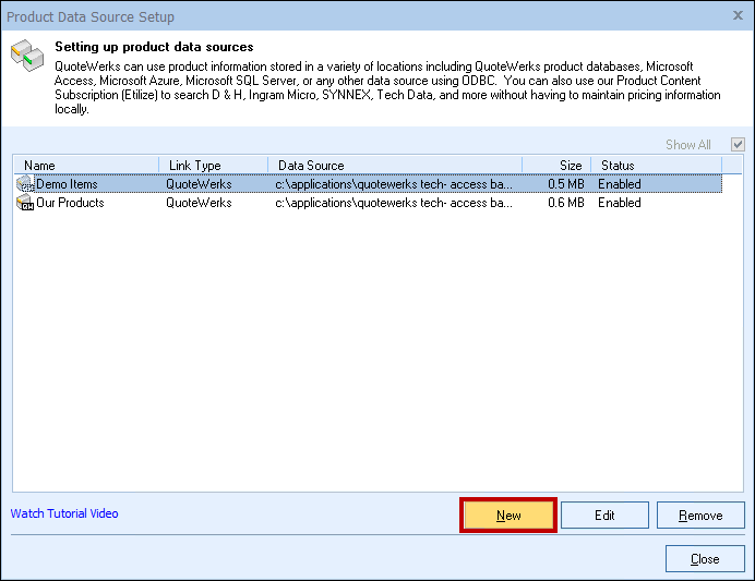 Step 2: In QuoteWerks, click on the Products -> Setup Product Sources menu, then select the [New] button on the Product Data Source Setup window:
