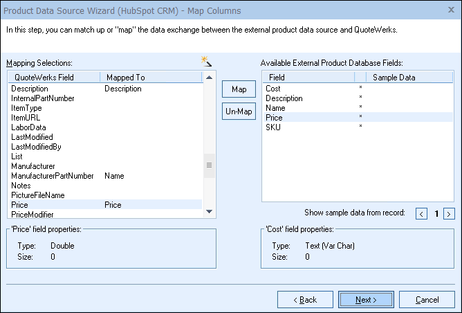 The fields available to be mapped include cost, description, name, price, and SKU.