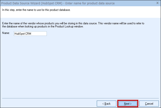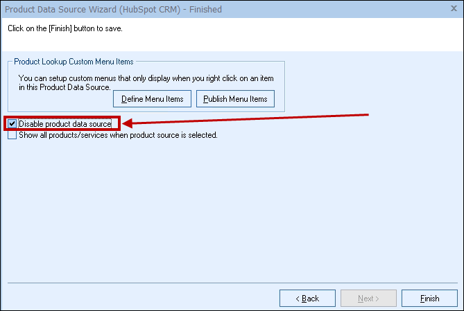 Step 9: Once you click on the [Finish] button it will return you to the Product Data Source Setup window where you can confirm that the link to the HubSpot CRM product list was established: