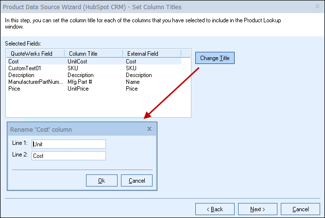 For example, in QuoteWerks the field name is called ‘Cost' but the Column Title is 'Unit Cost'. You may want to refer to this as simply ‘Cost.’ By clicking on the [Change Title] button you can rename the column title: