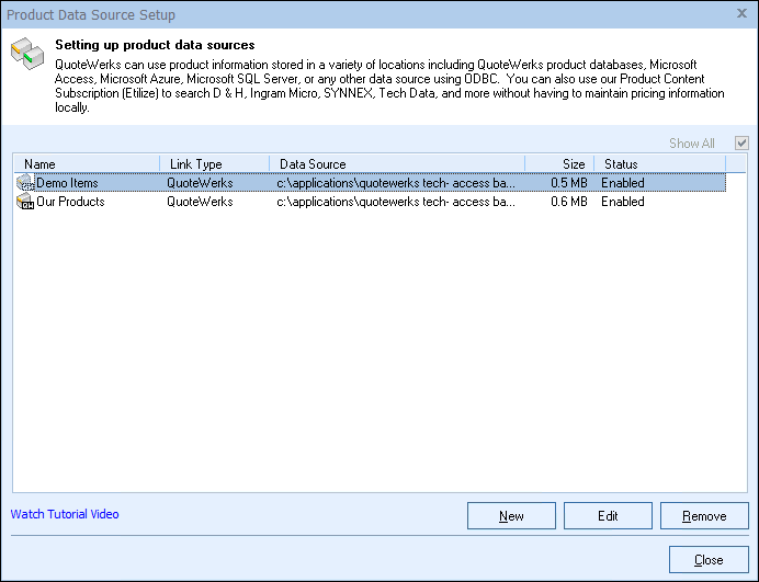 Step 2: In QuoteWerks, go to the Products -> Setup Product Sources menu, then select the [New] button on the Product Data Source Setup window: