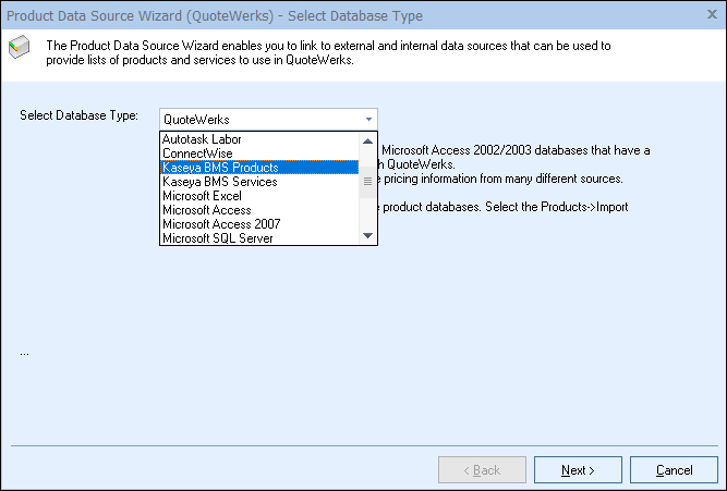 Step 3: From the “Select Database Type” window, select “Kaseya BMS Products” or "Kaseya BMS Services” from the drop down menu: