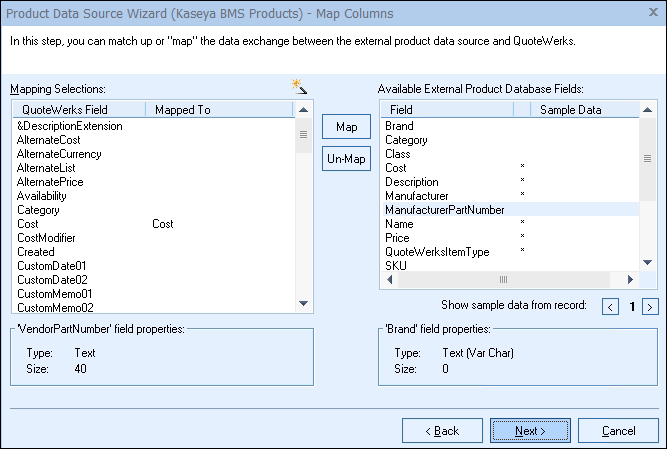 If you want to change our default selections, simply select the Kaseya BMS field on the right, then select the QuoteWerks field on the left and choose to map or un-map the fields.
