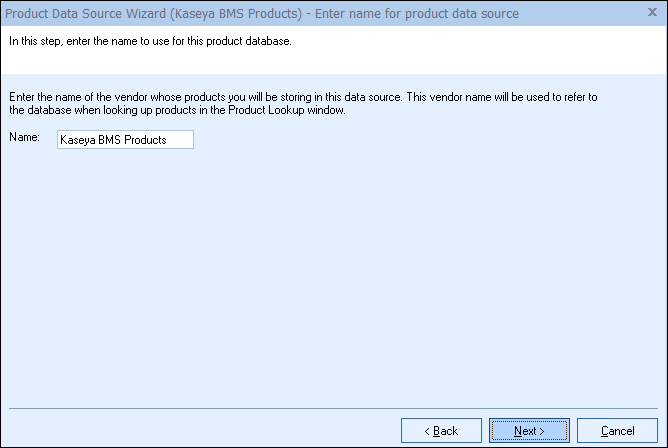 Step 5: On this window you can set the name of the product data source. It is highly recommended that you use the name “Kaseya BMS Products” when setting up the products database and “Kaseya BMS Services” when setting up the services database, but you can enter in an alternate name if you would like to.