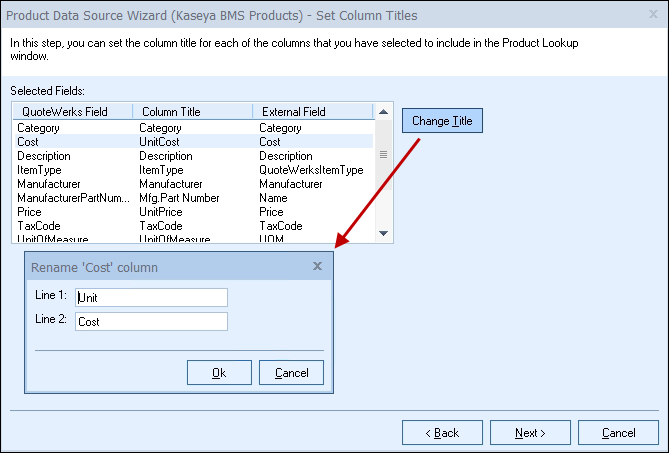 For example, in QuoteWerks the field name is called ‘Cost' but the Column Title is 'Unit Cost'. You may want to refer to this as simply ‘Cost.’ By clicking on the [Change Title] button you can rename the column title: