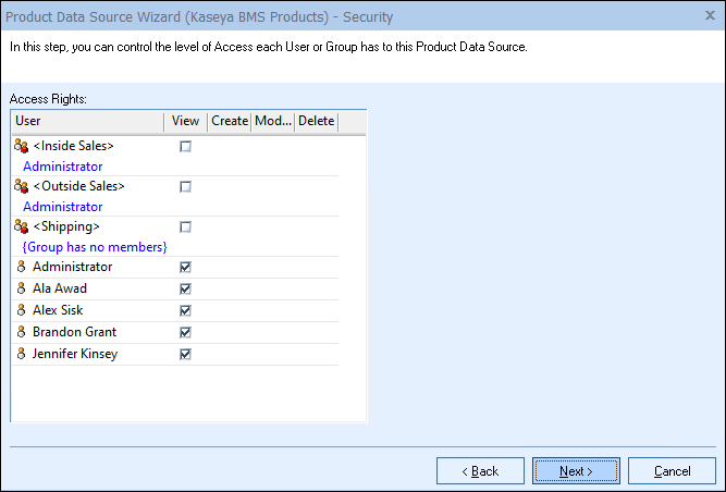 Step 7: If the ‘Individual Product Data Source level security’ has been enabled, the Security step will appear next: