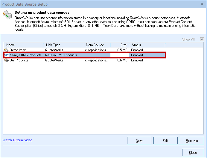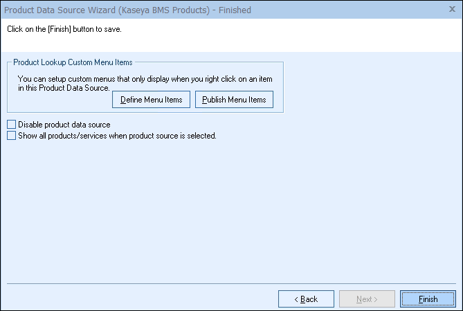 Step 9: Once you click on the [Finish] button it will return you to the Product Data Source Setup window where you can confirm that the link to the Kaseya BMS Products database or Kaseya BMS Services database was established: