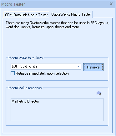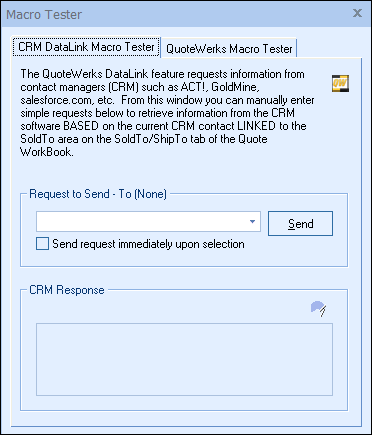 The Macro Tester is available under the Contacts-> Macro Tester menu option. This two tabbed feature enables users to quickly pull in data via the DataLink based on the currently selected contact on the Sold to/ Ship to tab and also view a list of supported macros. This feature is available for any of the native QuoteWerks CRM/PSA integrations.